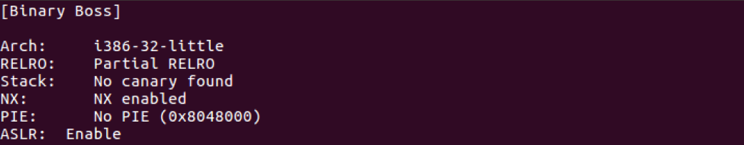 NX bit가 적용된 것으로 보아 스택에 쉘을 넣어 실행하지는 못할 것으로 보인다.