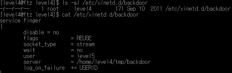 따라서 finger 서비스는 서비스를 실행하는 권한이 Level 5 권한이기 때문에 /home/level4/tmp/backdoor 파일을 Level 5의 권한으로 실행할 것입니다.