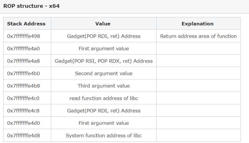 - x64에서는 Gadgets을 이용해 인자 값을 레지스터에 저장한 후에 함수를 호출한다.