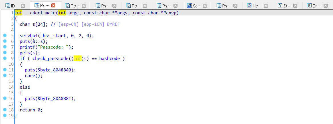 처음에 gets 함수를 통해 입력을 받는데, 입력받은 것을 check_passcode() 인자로 넘겨서 반환되는 값이 hashcode와 같을 경우 core() 함수를 실행한다.