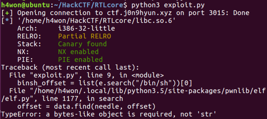 여기서 또 한 가지 주의할 점이 있는데, python3를 사용하는 경우 "/bin/sh" 의 offset을 구할 때 앞에 b를 붙어 byte 형태로 바꿔주어야 한다.