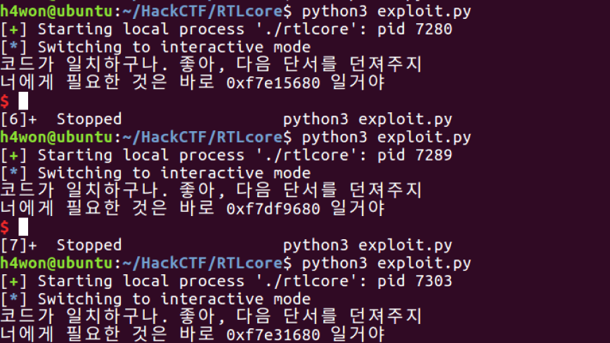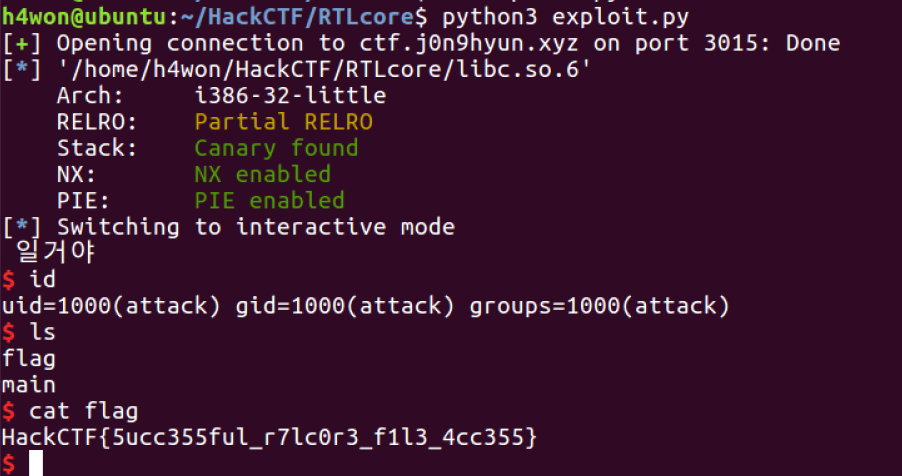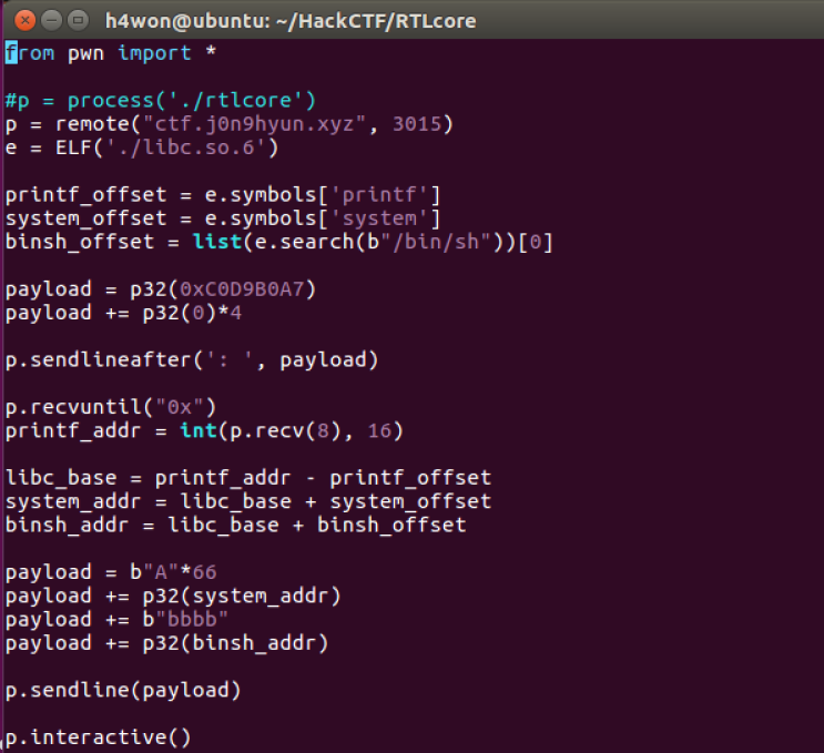 문제에서 같이 준 libc.so.6 라이브러리 파일을 참조해서 주소값을 구해야 된다는 점을 빼고는 다른 RTL 문제와 비슷했다.