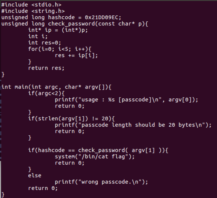 argv[1]으로 인자를 받아 check_password()의 인자로 넘겨주는데, check_password()의 반환값과 hashcode 값이 동일할 경우 flag 파일을 볼 수 있다.