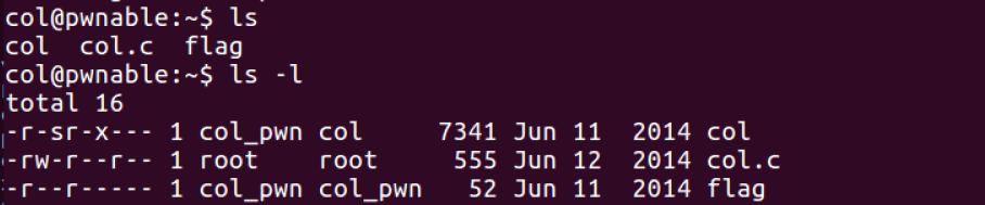 접속을 해서 file들을 확인하니 col, col.c, flag 파일이 있다.