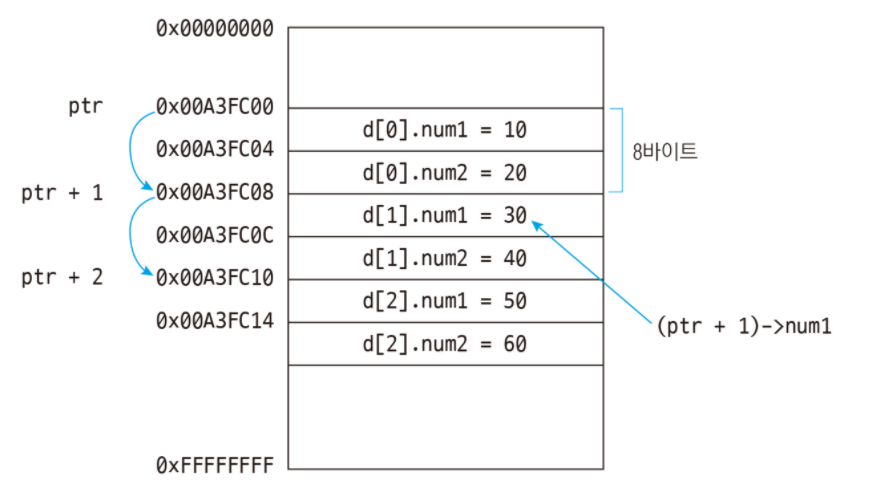 printf("%d %d\n", (ptr + 2)->num1, (ptr + 2)->num2); // 50 60: 구조체 배열에서 멤버의 값 출력