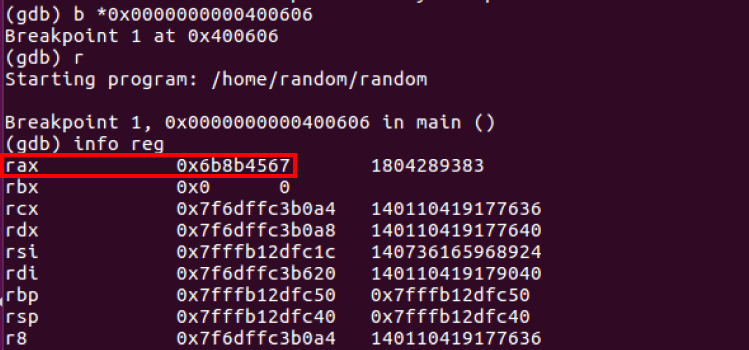 rand() 함수가 호출된 후에 bp를 걸어 반환값을 확인해보자.
