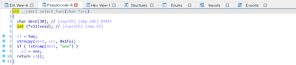 strncpy 를 통해 dest에 복사를 하는데, 한 바이트만큼 오버플로우 발생한다.