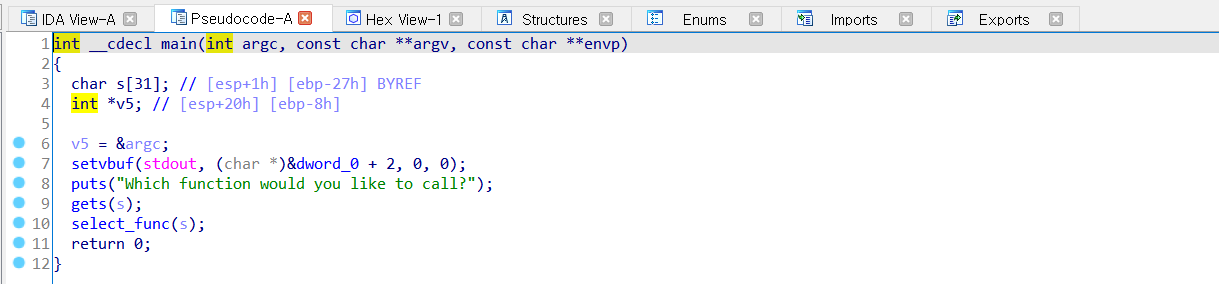 puts() 를 통해 출력을 하고, gets() 를 통해 입력을 받은 뒤 select_func() 함수를 실행한다.