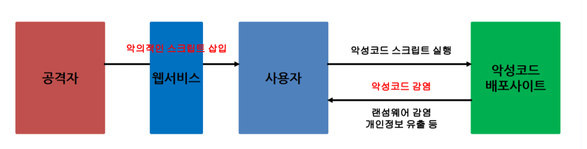 - 공격자는 게시판에 악의적인 행위를 하는 스크립트를 삽입