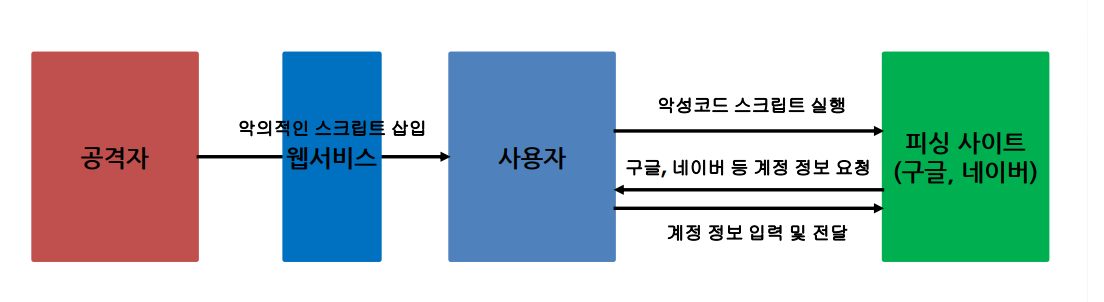 - 클라이언트 스크립트 (Javascript, VBscript 등) 를 이용하여 사용자에게 특정 행위를 하게 해서 악의적인 목적으로 이용하는 것