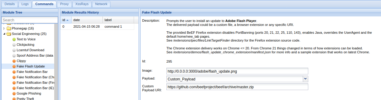 -> hook.js 가 페이지에 삽입되어 BeEf에 후킹되었음을 알 수 있다.
