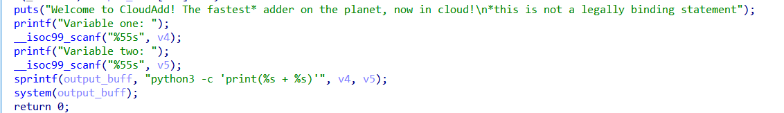 문자열 두 개를 입력 받아서 "python3 -c 'print(%s+%s)'" 형식으로 저장하고 그것을 system 함수를 통해 명령어를 실행시켜준다.