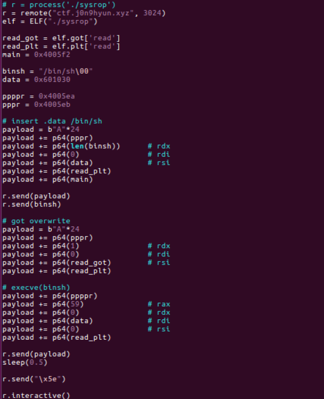 syscall rop = system call rop 을 이용해서 풀어준다.