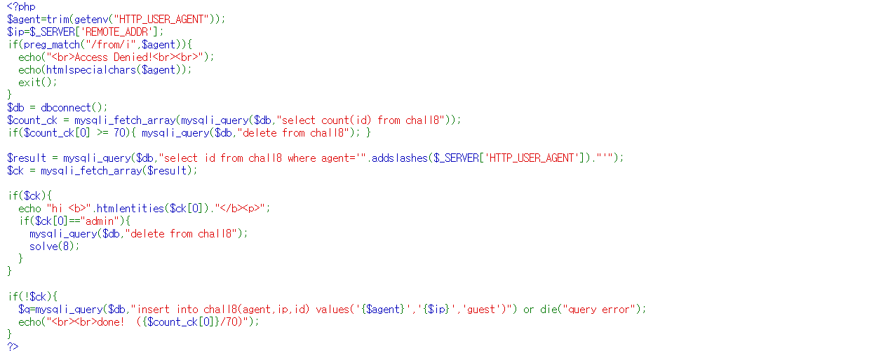소스 코드를 보면 특정 HTTP_USER_AGENT 인 id 값을 가져와 $ck에 저장한다.