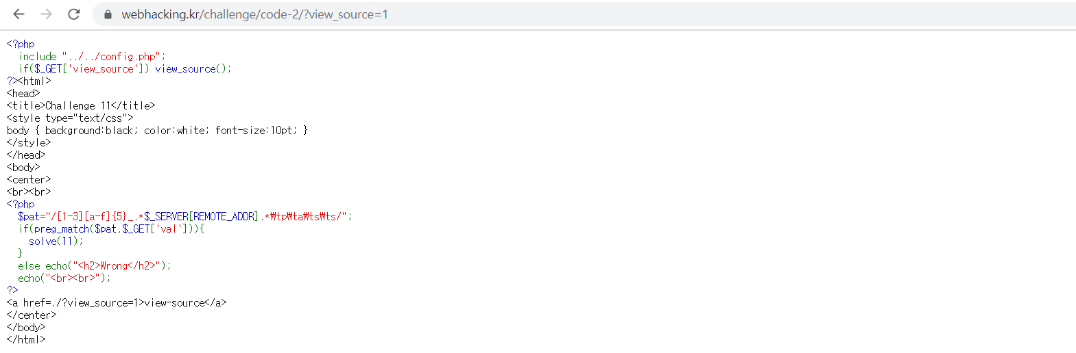 Php 부분을 살펴보면 get 방식으로 받은 ‘val’ 값과 정규표현식이 같을 경우 solve(11) 가 실행된다.