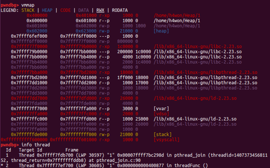 thread2의 힙영역(0x00007ffff0000000 ~ 0x00007ffff4000000)이 생성된 것을 확인 할 수 있다. 해당 영역은 brk를 사용해서 할당하는 main_thread와는 달리 mmap을 사용하여 힙 메로리가 생성된다.