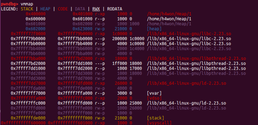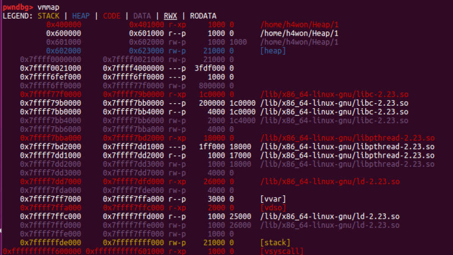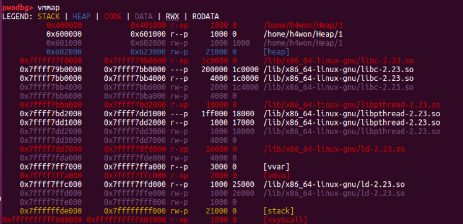 malloc이 호출되고, free 되기 전 상황. 힙 영역이 0x602000 ~ 0x623000 에 생성된 것을 확인할 수 있다.
