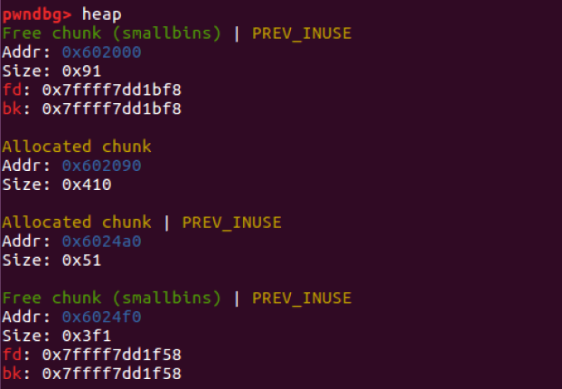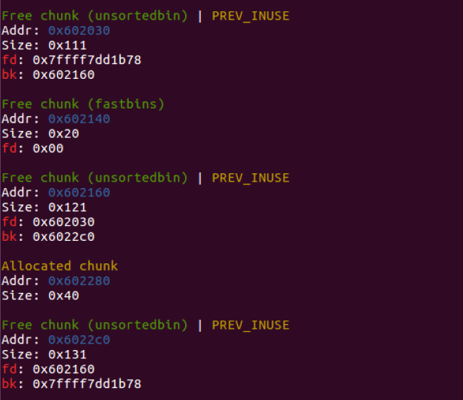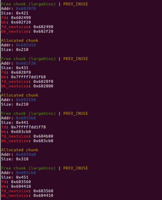 largebin[1] : 0x604b80 (size : 0x470) <---> 0x684418 (size : 0x468) <---> ....
