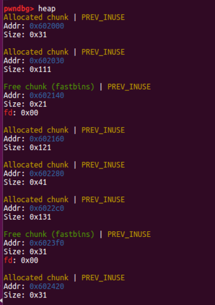 그 이후 malloc 요청시 동일한 크기의 영역을 다시 요청하는 경우 unsorted bin에 들어있는 청크를 바로 재사용 할 수 있게 한다. 이는 FIFO 방식으로 동작하며, malloc 요청으로 unsorted bin에서 검색된 청크들은 알맞은 사이즈인 경우 재사용을 하게 하고 알맞은 사이즈가 아닌 경우 이때 각자 자기의 bin(small or large bin)으로 돌아간다