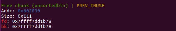 - f는 a2와 동일한 사이즈인 0x100를 요청한다. 위에 free(a2)를 호출했음으로 unsorted bin에 해당 청크가 들어가 있을 것이다. 따라서 이 청크를 재사용하여 할당할 것이다.