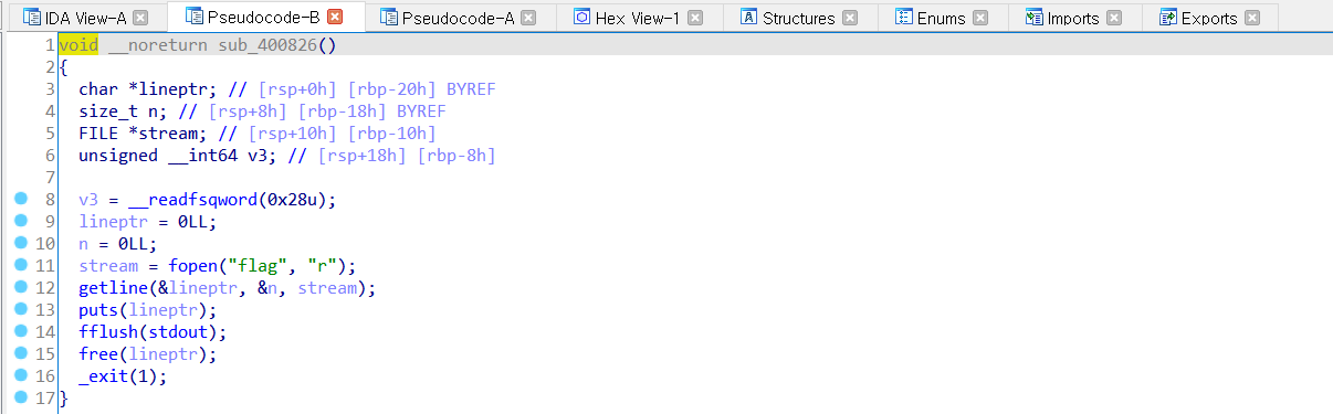 우선 bof 를 통해 v4+1 에 exit_got 주소를 쓰고, fgets 입력 시 sub_400826 함수 주소를 입력하면 될 것 같음.