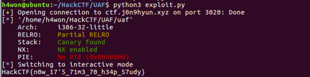 그리고 다시 첫번째 인덱스로 print_note() 함수를 실행하면, overwrite 된 magic() 함수가 실행될 것이다.