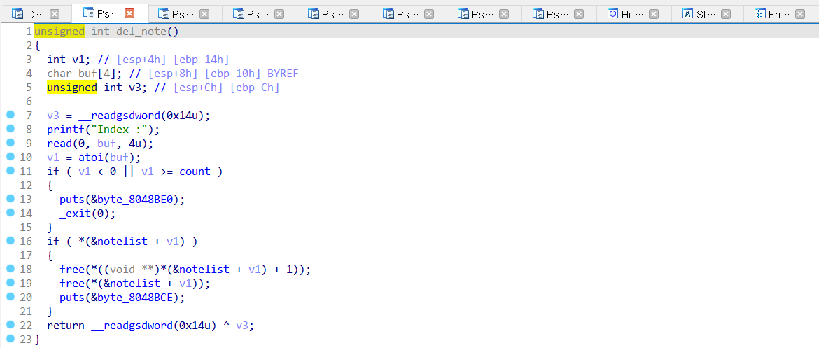 그래서 del_note() 에서는 먼저 어떤 인덱스를 지울건지 묻고 두 번 free 를 해준다.