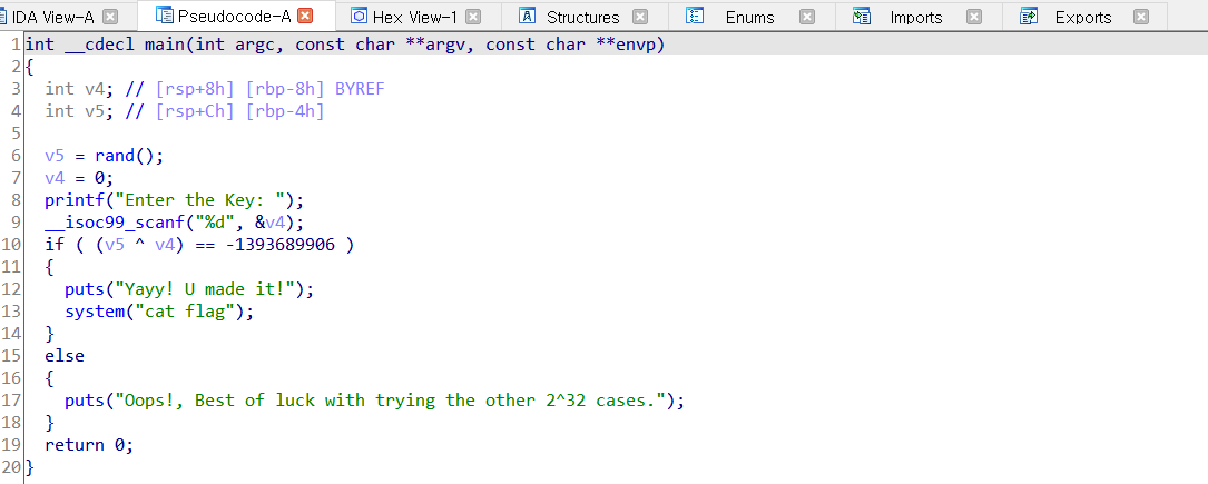 rand() 함수의 경우 시드값을 설정해주지 않으면 항상 일정한 값을 생성하기에 rand() 결과 값과 -1393689906 값을 비트 연산한 것을 입력값으로 주면 될 것이다.