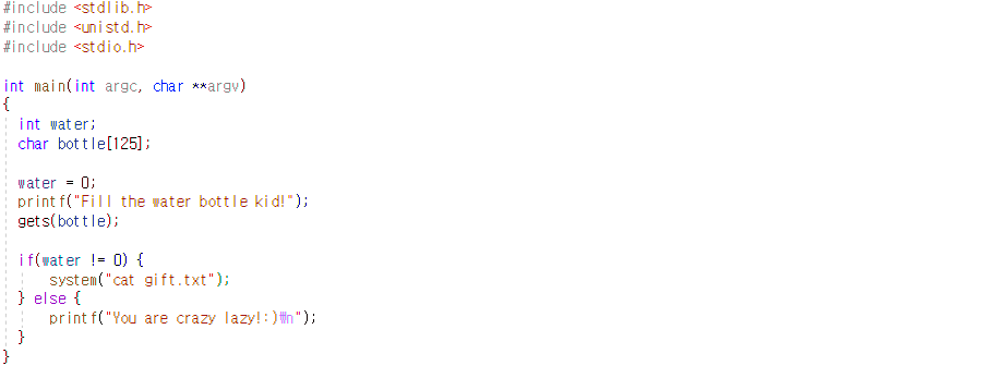 water값 앞 까지(125byte 만큼)를 더미로 채우고, water 값을 변경하면 system 함수가 실행될 것이다.