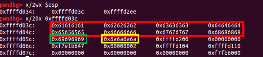 빨간색 박스가 입력한 문자열이 buf 변수, 즉 메모리 주소 0xffffd03c에 저장된 것이고, 초록색 박스가 SFP, 노란색 박스가 RET이다.