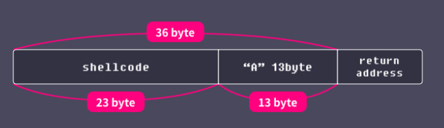 아까 만든 쉘코드의 경우 23byte기 때문에 RET를 건드리기 전까지 더미값을 넣어주고 최종적으로 RET에 buf의 시작주소를 넣어주면 우리가 준비한 쉘코드가 실행되어 쉘을 획득할 수 있을 것이다.