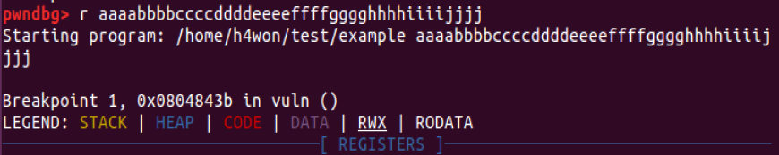 취약점이 존재하는 vuln 함수에 브레이크포인트를 설정한 후 오프셋을 확인하기위해 첫 번째 인자와 함께 example1 바이너리를 실행해 보겠다.