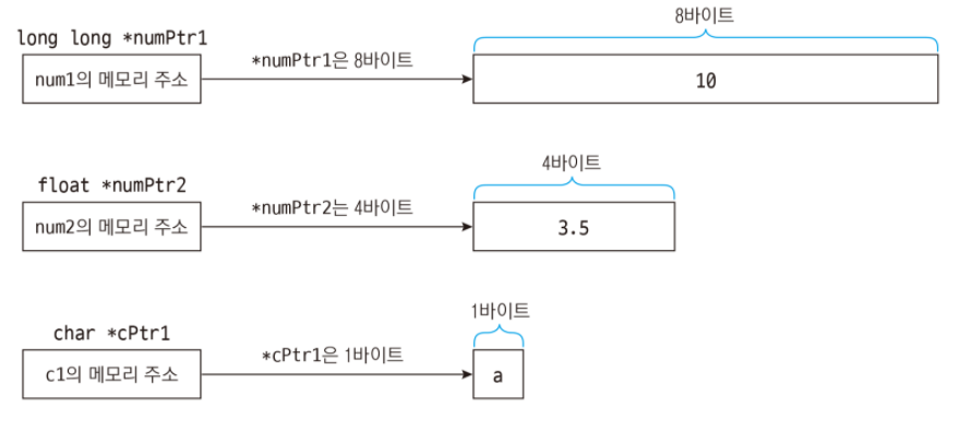 즉, long long 포인터는 8바이트 크기만큼 값을 가져오거나 저장하고, char 포인터는 1바이트 크기만큼 값을 가져오거나 저장한다.