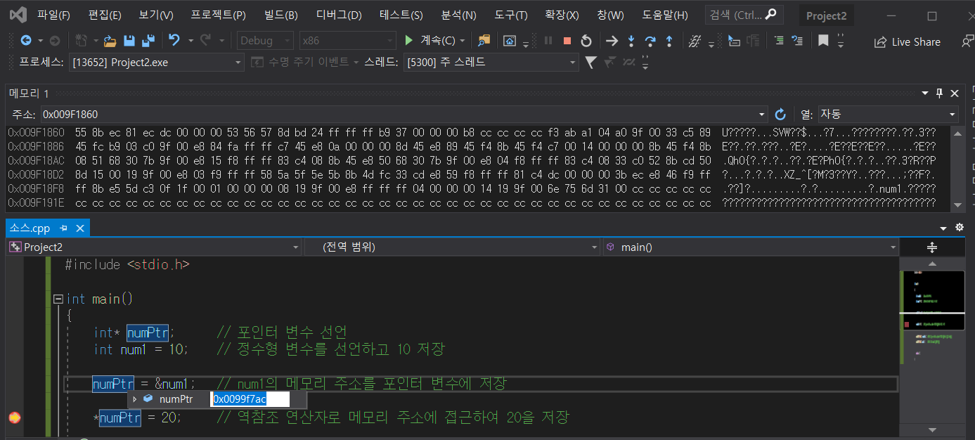 numPtr = &num1; // num1의 메모리 주소를 포인터 변수에 저장