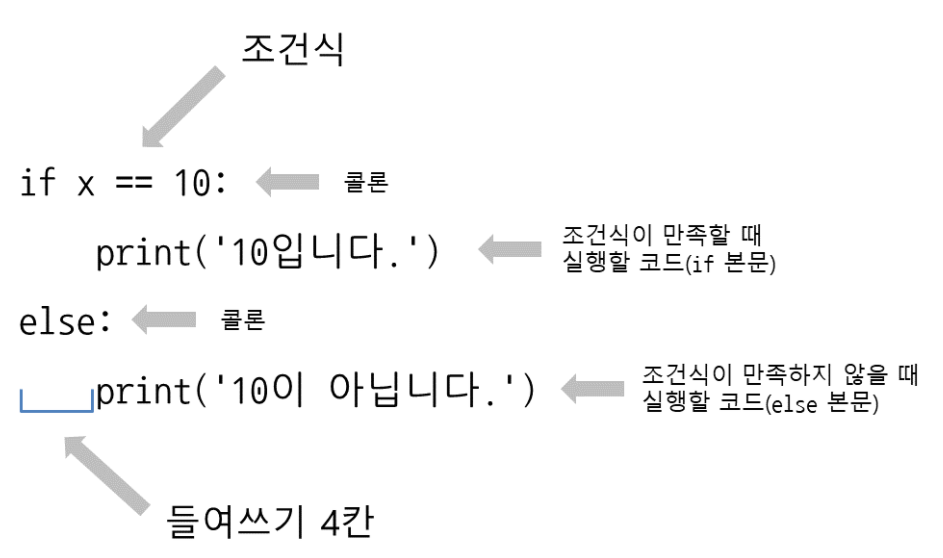 즉, 조건식이 참(True)이면 if의 코드(if 본문)가 실행되고, 거짓(False)이면 else의 코드(else 본문)가 실행된다.